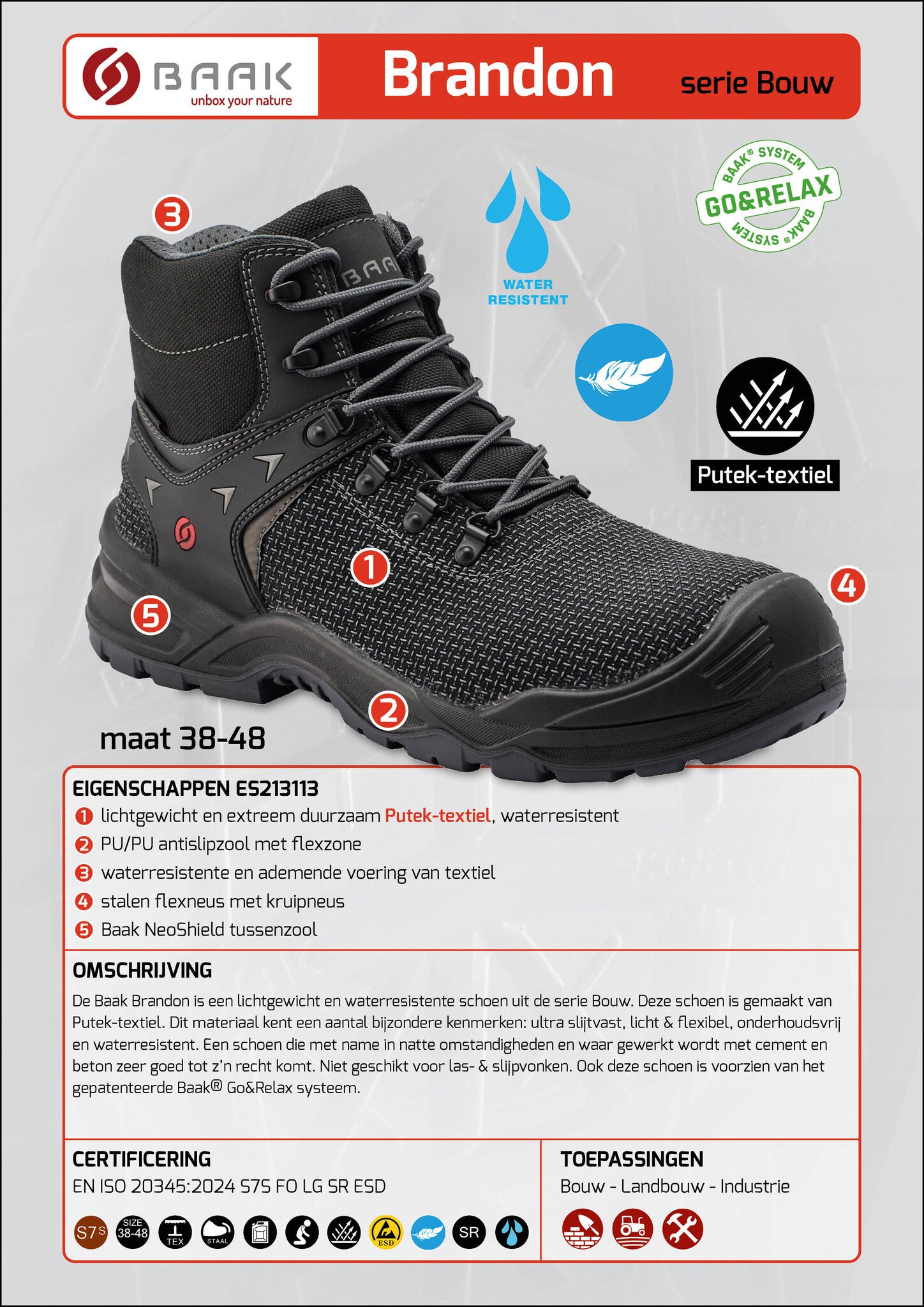 De Baak Brandon is een lichtgewicht en waterresistente schoen uit de serie Bouw. Deze schoen is gemaakt van Putek-textiel. Dit materiaal kent een aantal bijzondere kenmerken: ultra slijtvast, licht & flexibel, onderhoudsvrij en waterresistent. Een schoen die met name in natte omstandigheden en waar gewerkt wordt met cement en beton zeer goed tot z’n recht komt. Niet geschikt voor las- & slijpvonken.