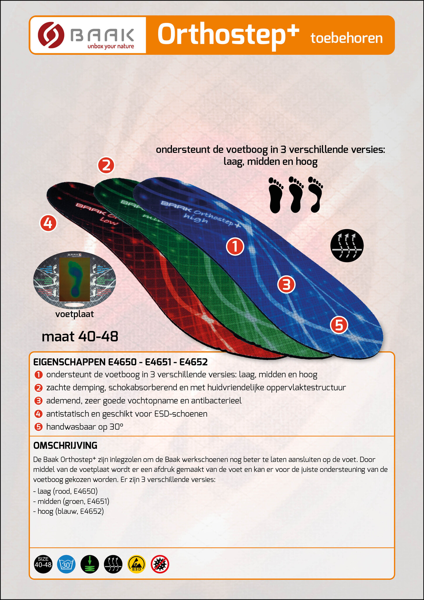 De Baak Orthostep+ zijn inlegzolen om de Baak werkschoenen nog beter te laten aansluiten op de voet. Door middel van de voetplaat wordt er een afdruk gemaakt van de voet en kan er voor de juiste ondersteuning van de voetboog gekozen worden. Er zijn 3 verschillende versies: