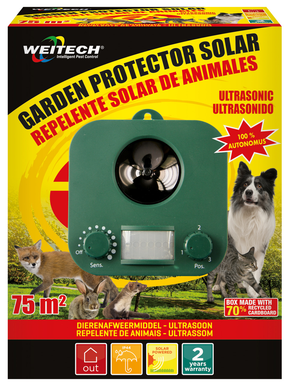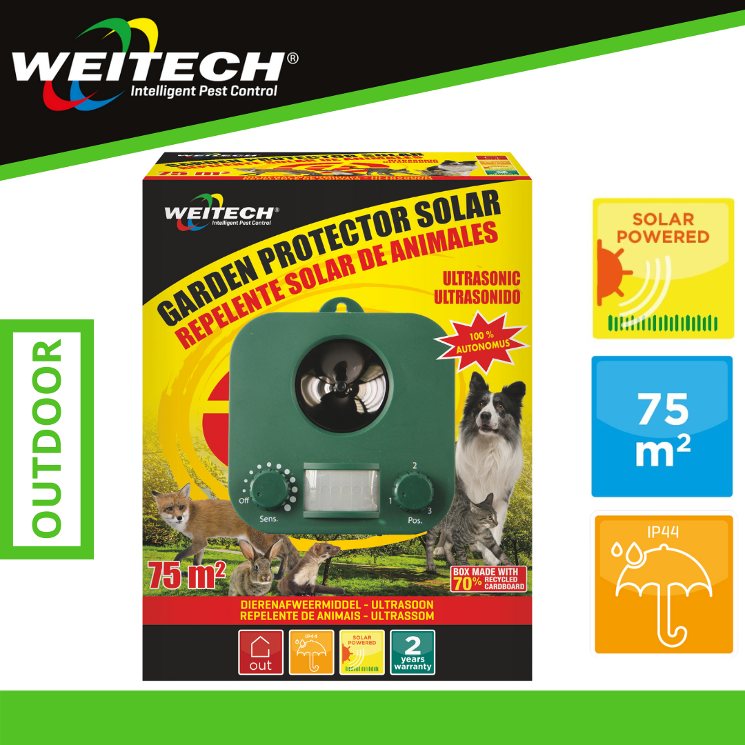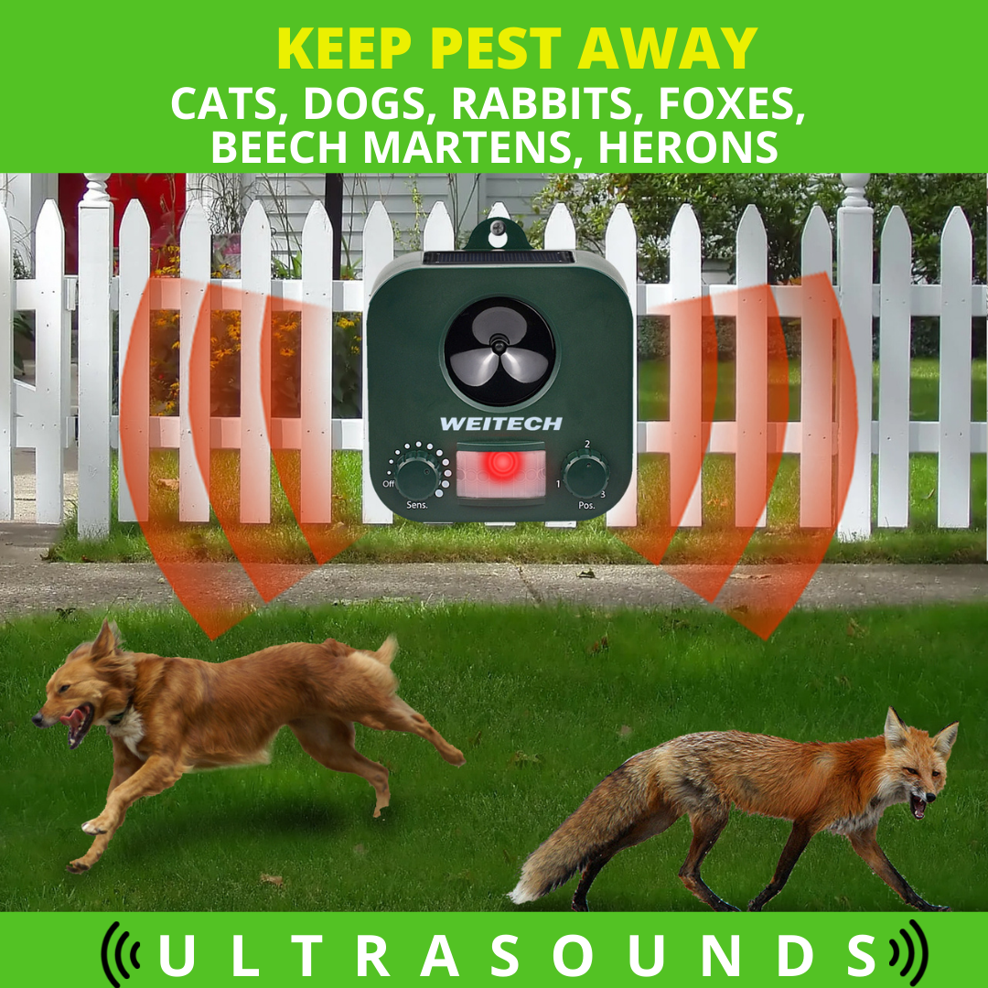 Verjaagt honden, katten, vossen, konijnen, steenmarters, reigers enz. uit tuinen en van terrassen met behulp van ultrasone trillingen.