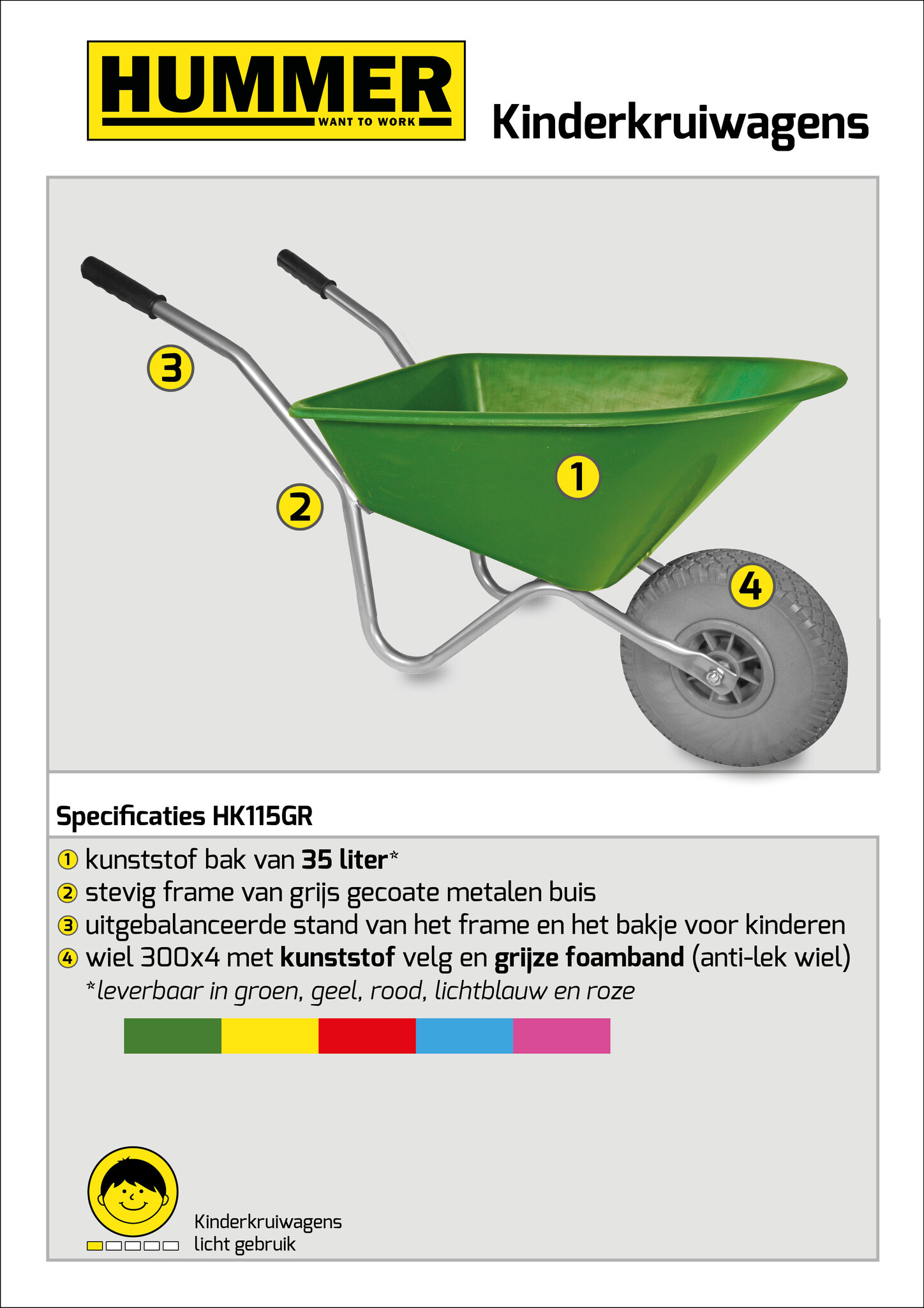 Groene kunststof bak van 35 liter en frame van grijs gecoat metaal. Wiel 300x4 met kunststof velg en grijze foamband. Zeer geschikt voor kinderen door de uitgebalanceerde stand van het frame en van het bakje. Nooit meer een lekke band door het anti-lek wiel! Bijpassend presentatie rek: HDS18.