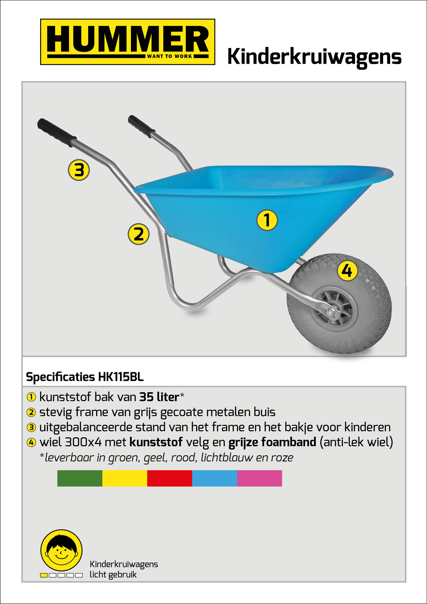 Lichtblauwe kunststof bak van 35 liter en frame van grijs gecoat metaal. Wiel 300x4 met kunststof velg en grijze foamband. Zeer geschikt voor kinderen door de uitgebalanceerde stand van het frame en van het bakje. Nooit meer een lekke band door het anti-lek wiel! Bijpassend presentatie rek: HDS18.