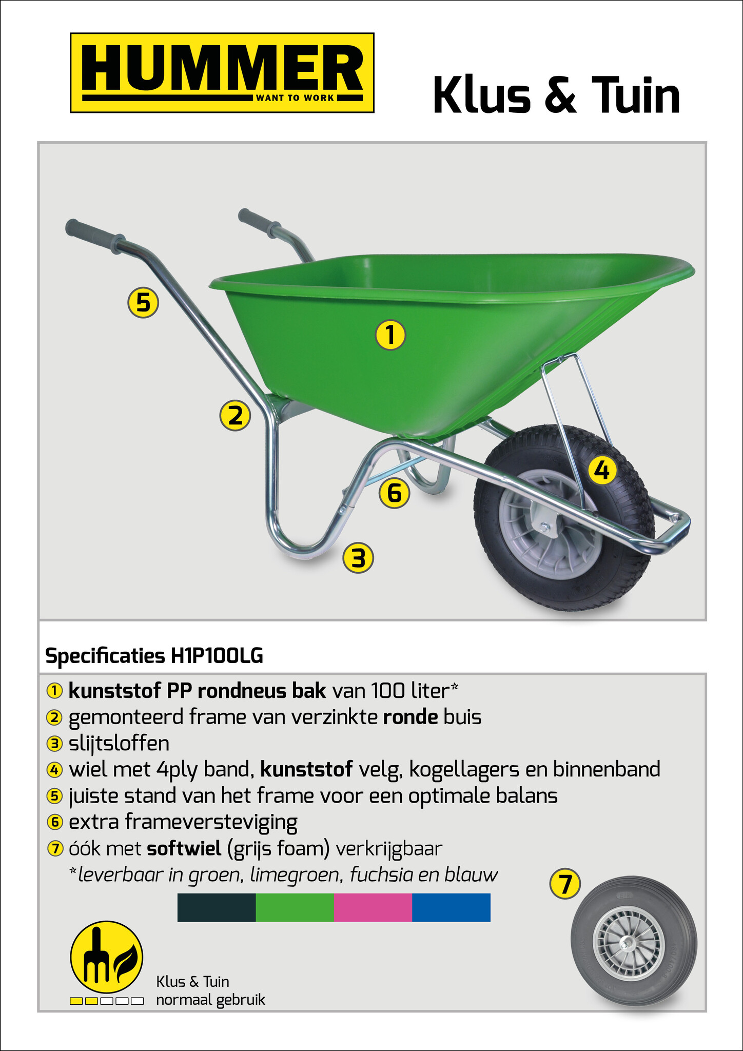 Kunststof PP bak 100 liter. 2-delig frame van premium verzinkte ronde buis en voorzien van slijtsloffen. Wiel 400x8 met kunststof velg, kogellagers en grijze foamband. Deze kruiwagen is ook ongemonteerd in doosverpakking verkrijgbaar: H2P100LGSW.