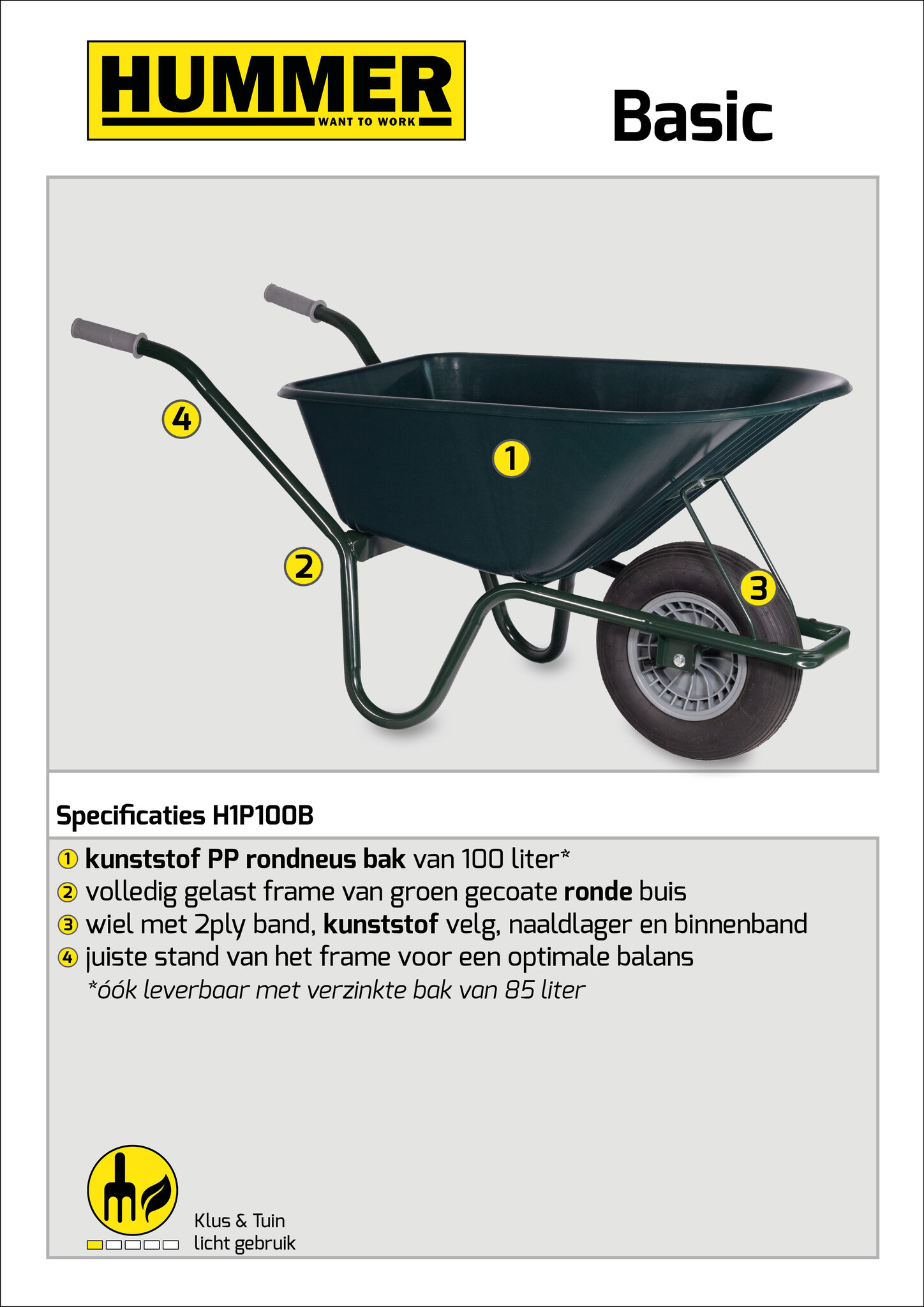 Kunststof PP bak 100 liter met rechte neus. Volledig gelast frame van basic groen gecoate ronde buis in RAL 6009. Wiel 400x8 2ply met kunststof velg, naaldlager en binnenband. Deze kruiwagen is ook gemonteerd verkrijgbaar: H1P100B.