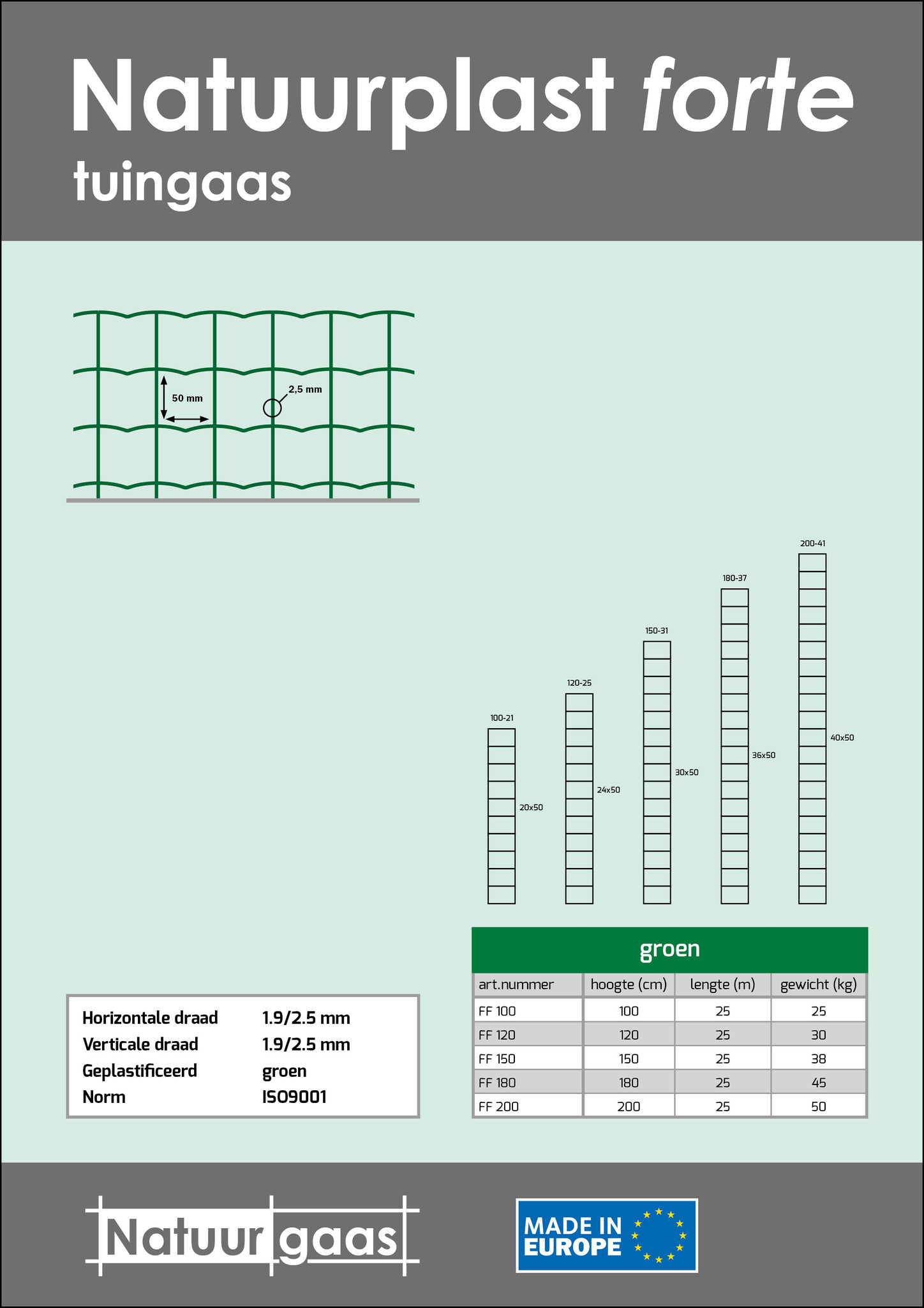| FF150 | 50x50 mm | 1,9/2,5 mm | 150 cm | 25 m | 12 rollen | groen | 38 kg |