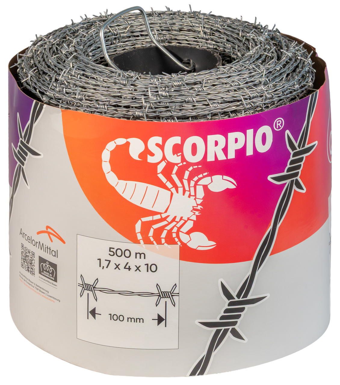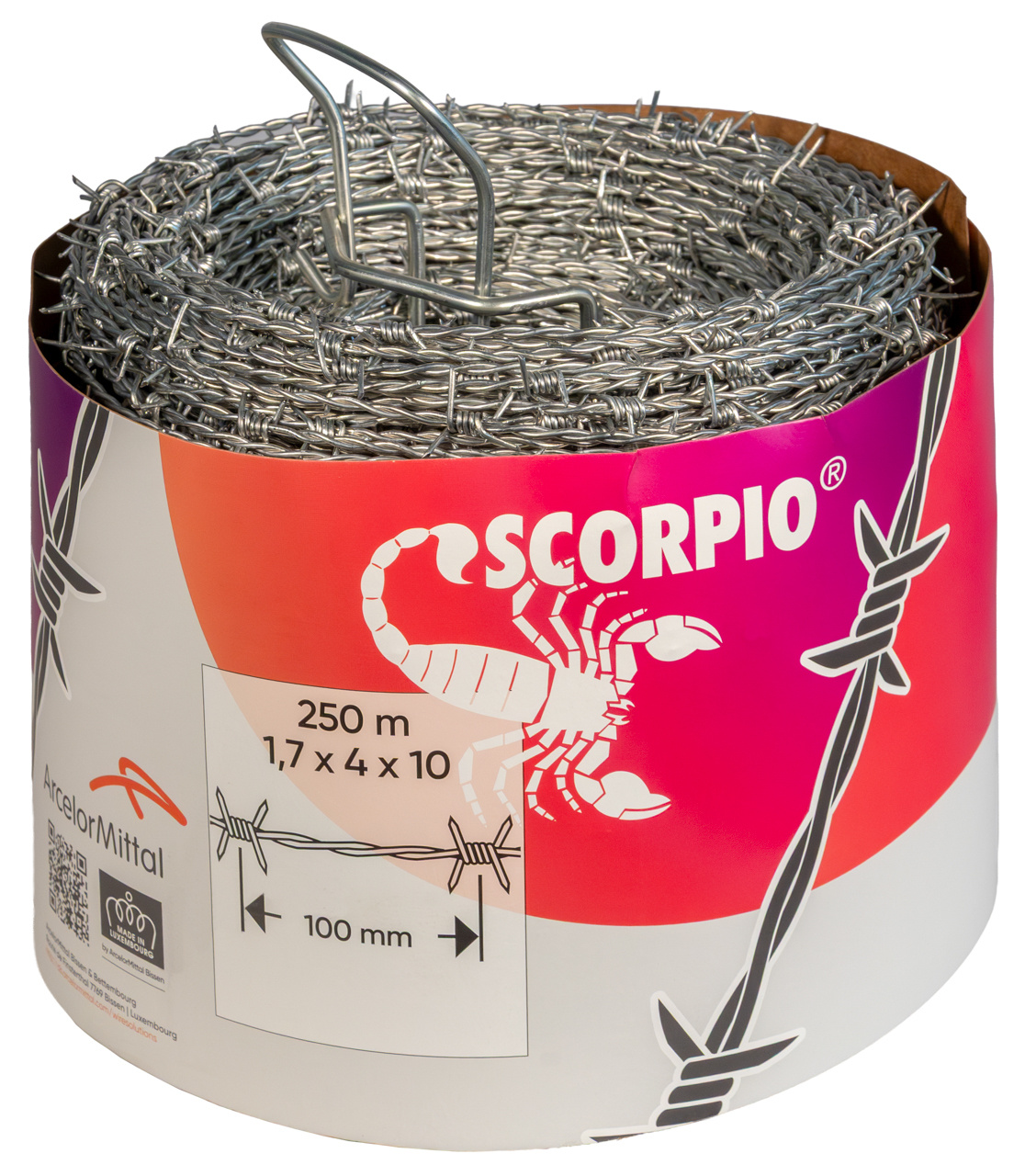 Scorpio® wordt vervaardigd uit harde staaldraden met een diameter van 1,70 mm. Deze puntdraad heeft een breuklast van 4400 N (gelijk aan puntdraad uit zachte draad met een diameter van 2,70 mm). Afwisselende torsies voorkomen het verschuiven van de punten en houden hen op regelmatige afstanden van 10 cm. Product conform aan de norm EN 10223-4. Bij de rol van 500 m zit er voor het afrollen een plastic buis in de kern.