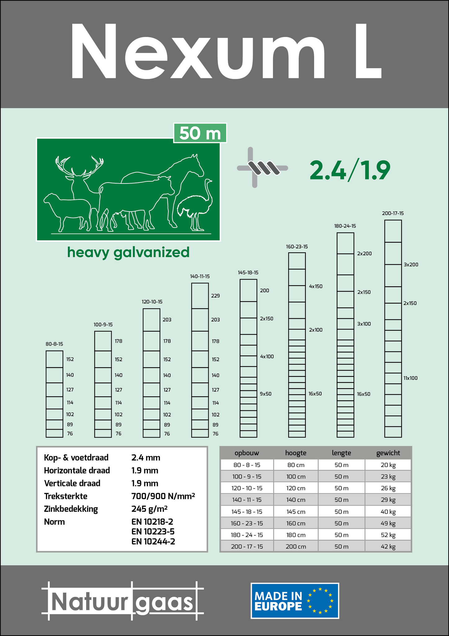 De ideale oplossing om weilanden af te rasteren. Kop- en voetdraad 2,4 mm, horizontale en verticale draden 1,9 mm. Nexum Basic is voorzien van horizontale draden met een treksterkte van 700-900 N/mm². Goed corrosiebestendig dankzij zwaar verzinkte kwaliteit, zinkbedekking 245 g/m². Product conform aan de normen EN 10218-2, EN 10223-5 en EN 10244-2.