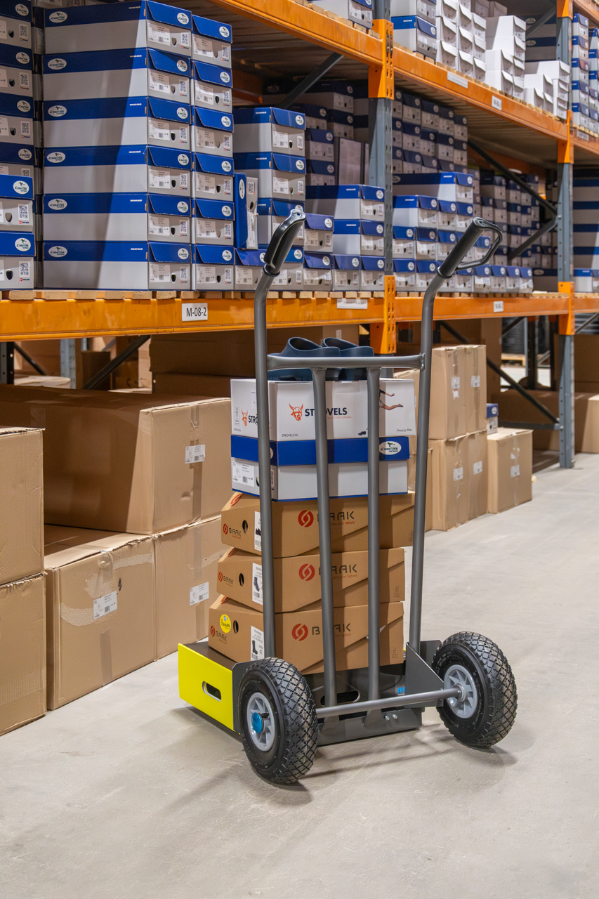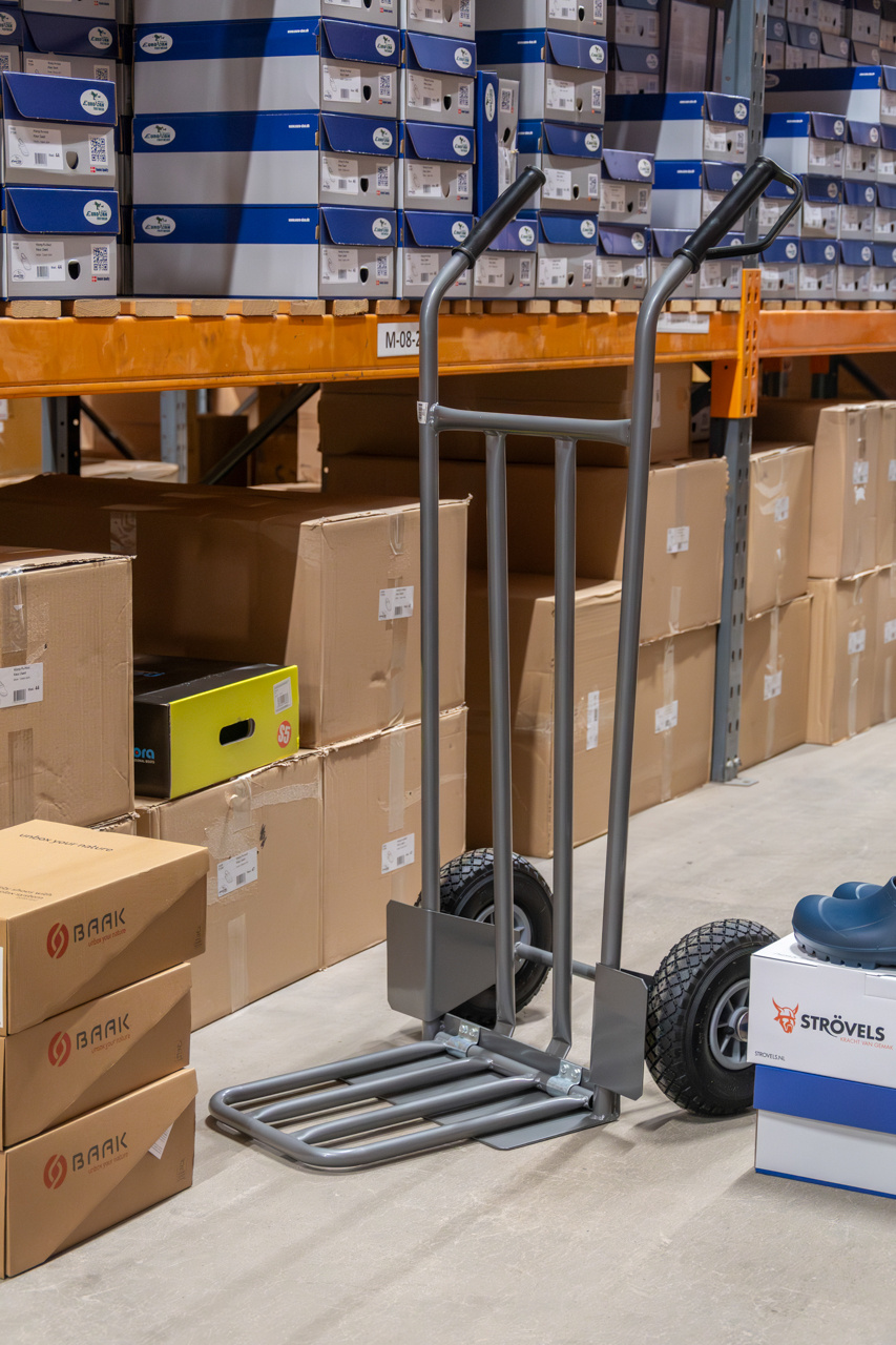 Steekwagen met uitklapbaar extra laadplateau van 30x40 cm. Frame van grijs gecoate buis in RAL 9007 (Ø 25 mm) met veiligheidshandvatten. Formaat 118x60 cm, bladmaat 40x19 cm. Geschikt voor max. 250 kg. Wielen 300x4 2ply met kunststof velg, kogellagers en binnenband.