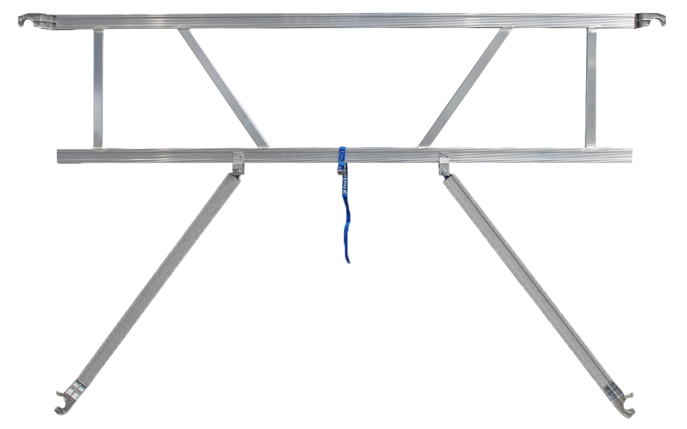 De voorloopleuning van aluminium is licht in gewicht, inklapbaar en makkelijk te hanteren. Te gebruiken op rolsteigers met een lengte van 185 cm, 250 cm en 305 cm.